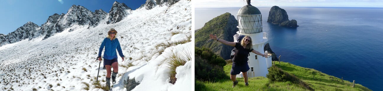 With a diverse and adventurous career, Adrienne has worn many hats. From mentoring at-risk youth and teaching primary kids in classrooms in New Zealand and Australia to parachute packer and later, an operations manager for skydivers. Adrienne has a science degree and is a conservationist at heart. She has experience in trapping and remote conservation work on Rēkohu, the Chatham Islands, and in the Southern Alps. Additionally, she guides hikers through New Zealand's wild landscapes, which comes second nature to someone who grew up in an outdoorsy Nelson family. She is truly at home in the outdoors, whether she's sea kayaking, mountain biking, camping, hiking or surfing. Under all those hats is a big beaming smile!