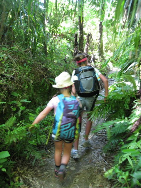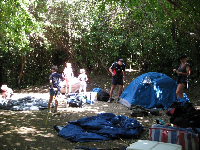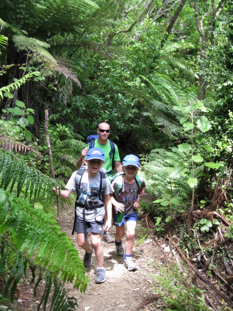 Next stop was Mistletoe Bay and only four hours walk from Portage. The children scampered along the track and did Tarzan impersonations as we made our way off the main track and down to the water's edge. This beautiful and sheltered campground prides itself on environmental sustainability. The tents were pitched in record time so we could all take the quintessential leap off the jetty into the aqua waters of the Queen Charlotte Sounds. The children jumped at the chance to hire kayaks and spent the late afternoon paddling around the calm waters of the bay. A couple of the adults took this chance to head off on a run to Anakiwa and whilst pounding/shuffling away on the track contemplated the potential of a camping holiday with bikes, running shoes and kayaks at Mistletoe Bay next summer. One of the great things about children is that they believe their parents are incapable of suffering from fatigue, so after the 25km run it was straight into a game of Frisbee with wild throws by children and adults alike, requiring an array of contortion moves to catch the thing.